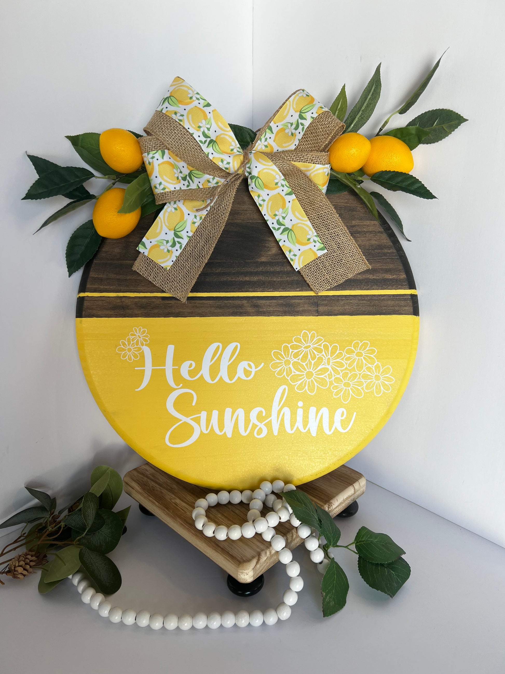 This cheerful handcrafted wooden door hanger features a bright yellow base with crisp white “Hello Sunshine” lettering, paired with faux lemons, greenery, and a layered lemon-print and burlap bow. It’s the perfect statement piece for summer and lemon-inspired farmhouse decor.