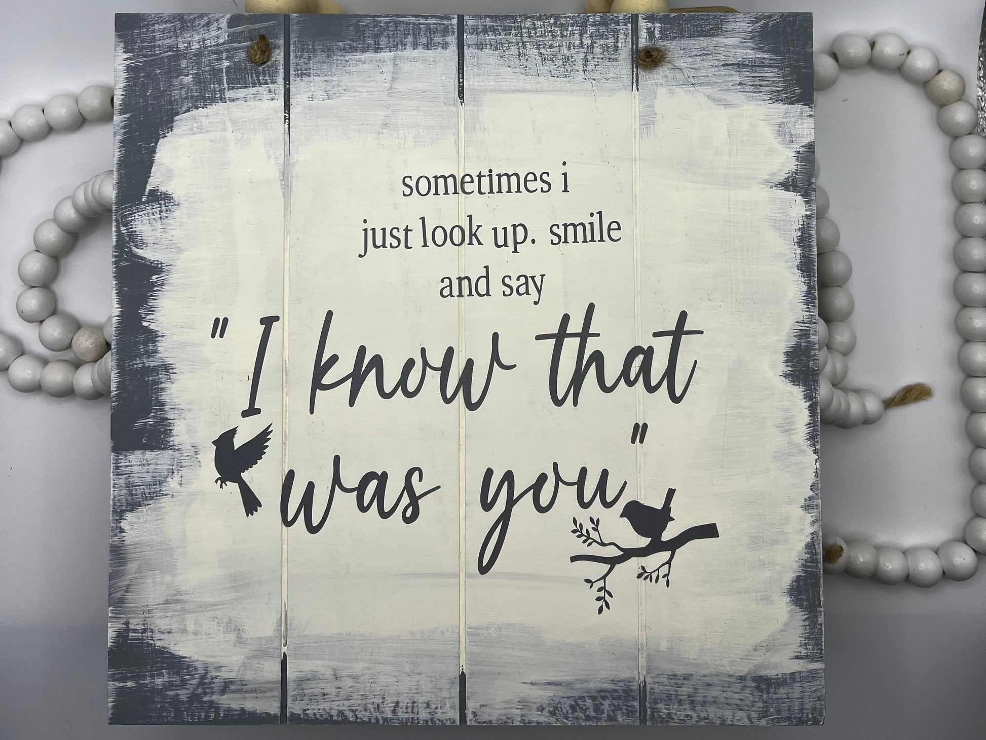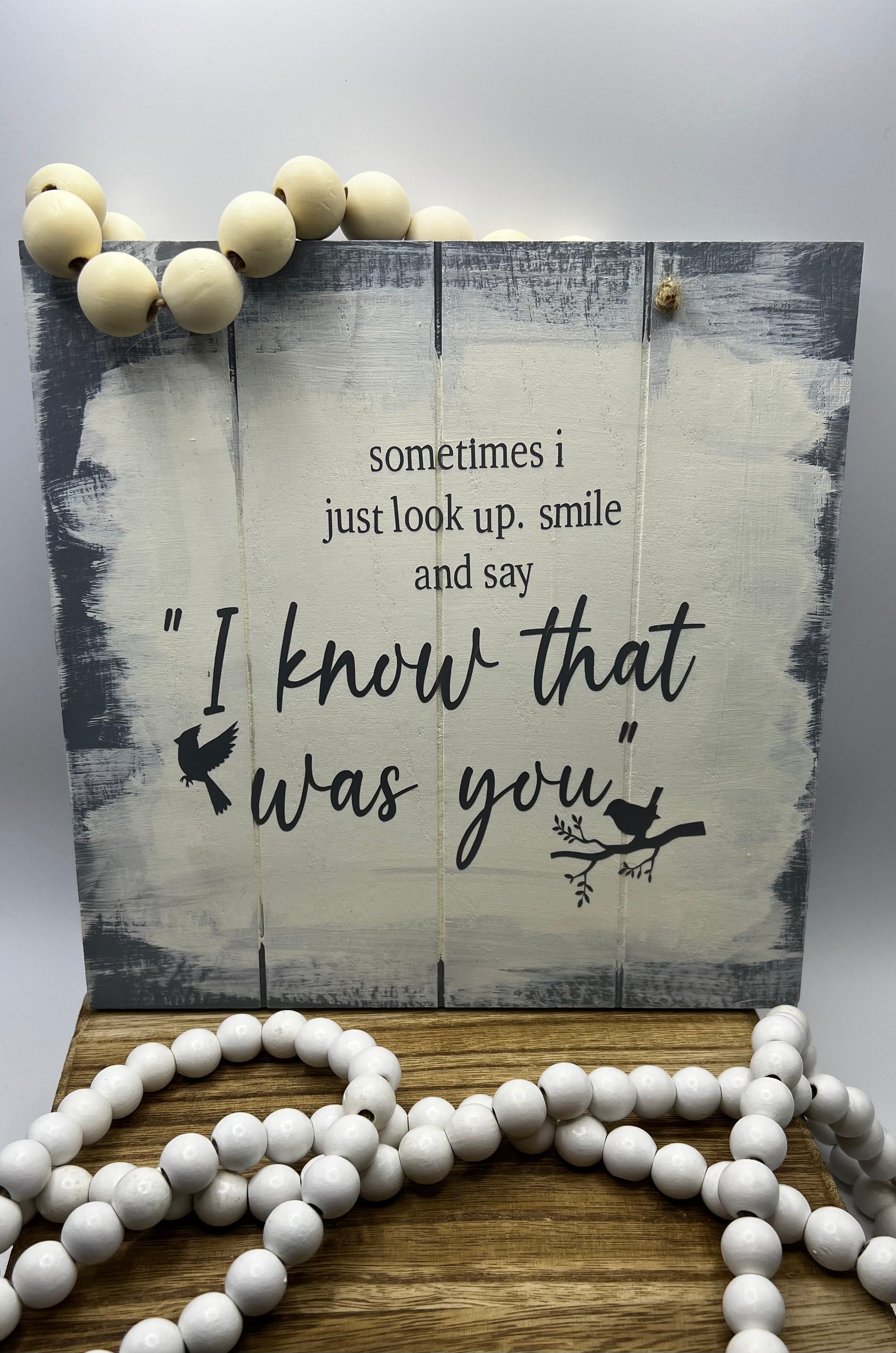 This handcrafted memorial wood sign is a beautiful reminder that our loved ones are always near. Featuring the heartfelt quote “Sometimes I just look up, smile and say ‘I know that was you’” along with soft distressed paint and decorative wooden beads, this sign brings comfort and peace to any space.