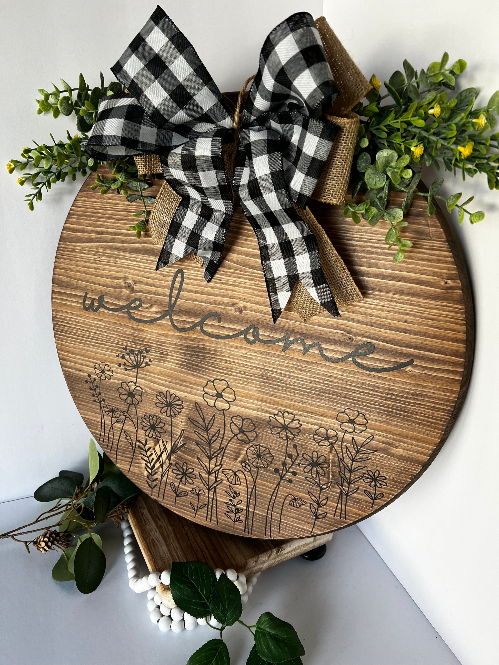 This handcrafted wooden round door hanger features a rich stained wood finish, delicate floral line art, and a flowing “welcome” script. Finished with layered greenery and a classic black-and-white buffalo check bow with burlap accents, this piece is perfect for year-round decorating.