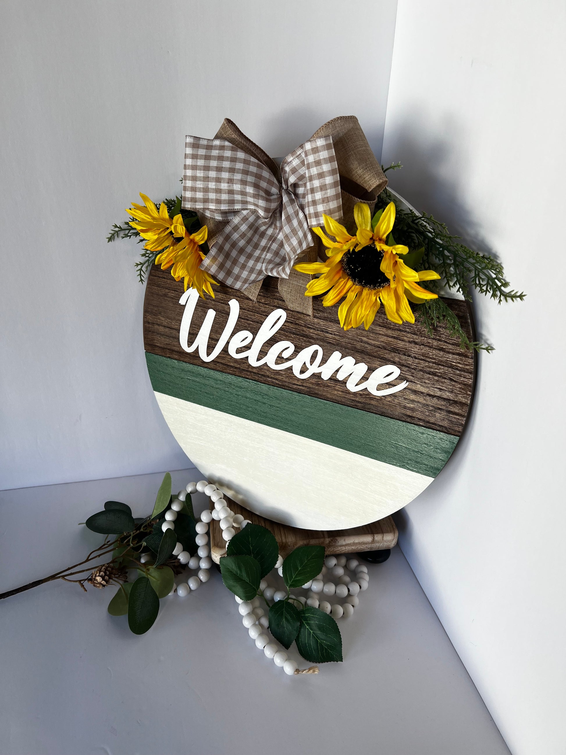 Welcome guests with warm farmhouse charm! This handcrafted wooden round door hanger features bright sunflower accents, a layered neutral bow, and a vinyl “Welcome” script. The mix of rustic wood tones and soft greenery makes it perfect for fall decorating, farmhouse homes, or year-round use.