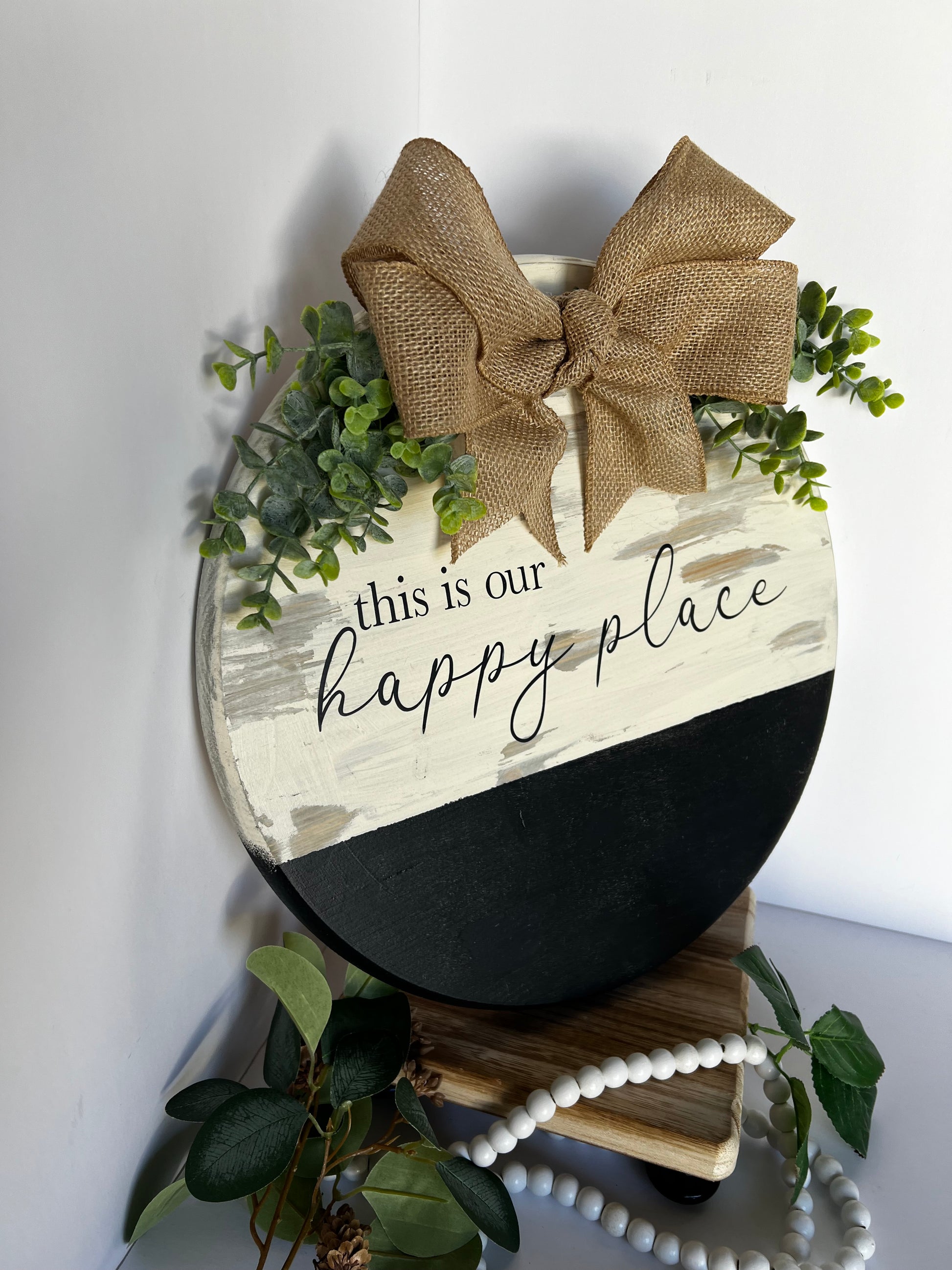 Create a cozy, welcoming feel in your home with this handcrafted “This Is Our Happy Place” wooden round sign. Designed with soft neutral tones, distressed detailing, and finished with a rustic burlap bow and greenery, this piece fits perfectly into farmhouse, modern rustic, or cottage-style decor.